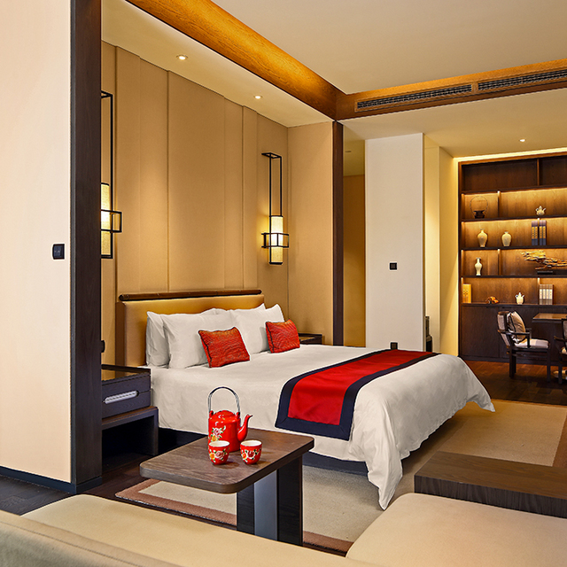 ▲ 豪华房(同一房型,内部格局会有不同,具体以实际安排为准)每间房都有景观可赏,或是山色,或见庭院,或赏天目湖景,46㎡起的空间,超过3米的挑高,让视觉和身心的舒适度都被放大。新中式的设计和家私,更是搭配得恰到好处。其中,豪华庭院房位于一楼,设有在窗边的私人浴缸,自带直通沿湖散步道的私家花园,天气好的时候,适合走出来看看景遛个弯。位于二楼的豪华湖景房,视野开阔,坐在阳台上便可一览湖景。入住首日迷你吧和客房小食免费享用。同时,客房内的细节,更是圈粉了不少酒店控,如:隐藏的升降式电视,再加上Krups的胶囊咖啡机,APPELLES小黑瓶,丝涟床垫和定制80纱支床品…一家酒店,如果能做到“以其为度假目的地而出发”,便成功了一半!要做到这点,单靠选址环境、高颜设计很难达到,它还需要配套能供给美食和休闲体验的空间分层。因此,在隐居天目湖WEI酒店内,它便将度假所需的吃与游体验,一一包揽。除了在天目Lounge一边品尝下午茶,一边欣赏天目湖景,还可前往御味轩中餐厅和TASTE全日餐厅,尝鲜时令在地美食。