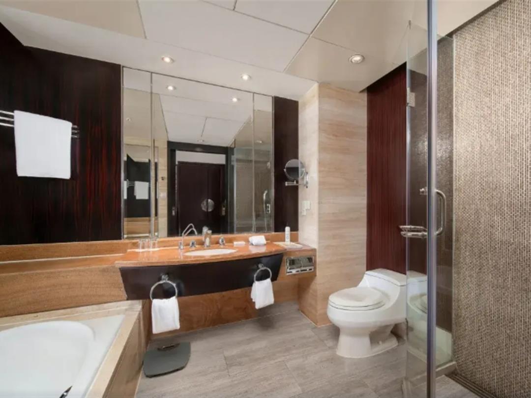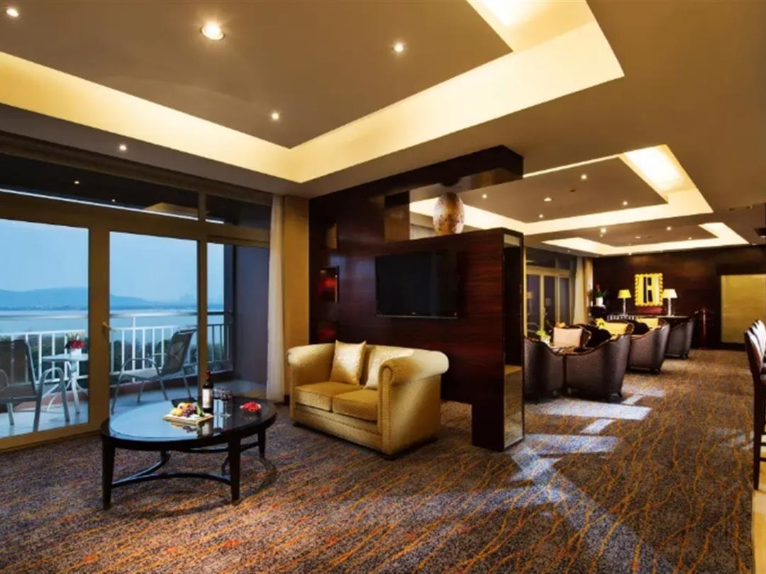 一期为副楼,以开元迎宾馆来命名,分为开元房(面积40㎡,大床2米,双床1.2米*2)和开元家庭套房(面积70–80㎡,内有1张1米特大床+1张1.2米宽单人床),均配有浴缸和阳台,部分高楼层的房间,坐在阳台上还能看着波光粼粼的湖面,很是惬意!