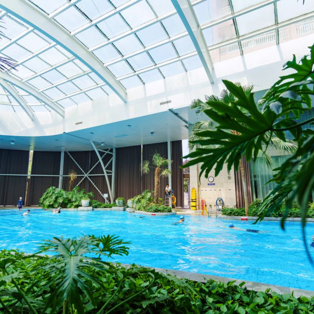 其中,室内恒温泳池很受欢迎,不光是面积够大,而且设计很用心,360度全透明顶棚,引自然光线入内,在里面游泳,犹如在亚马逊河谷的“热带雨林”玩水一般,深浅分区的泳池搭配,既满足成人的畅游需求,也为孩童提供了安全戏水的空间。