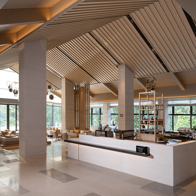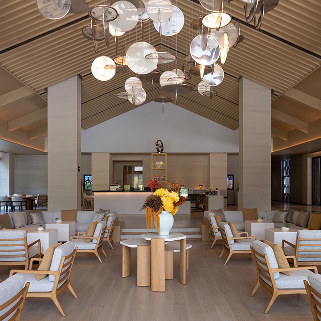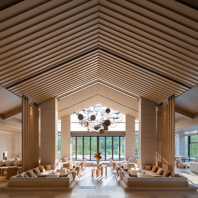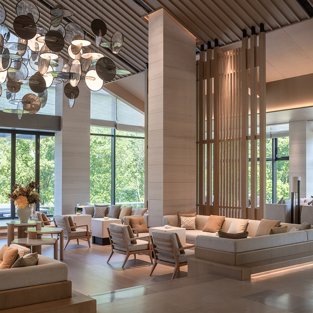 走入大堂,一眼就会被它“合”字型的挑高空间惊艳到,两大面窗框成画,垂落而下的灯饰绘制着仙居山景,大气的东方古韵,充满自然和人文之美。