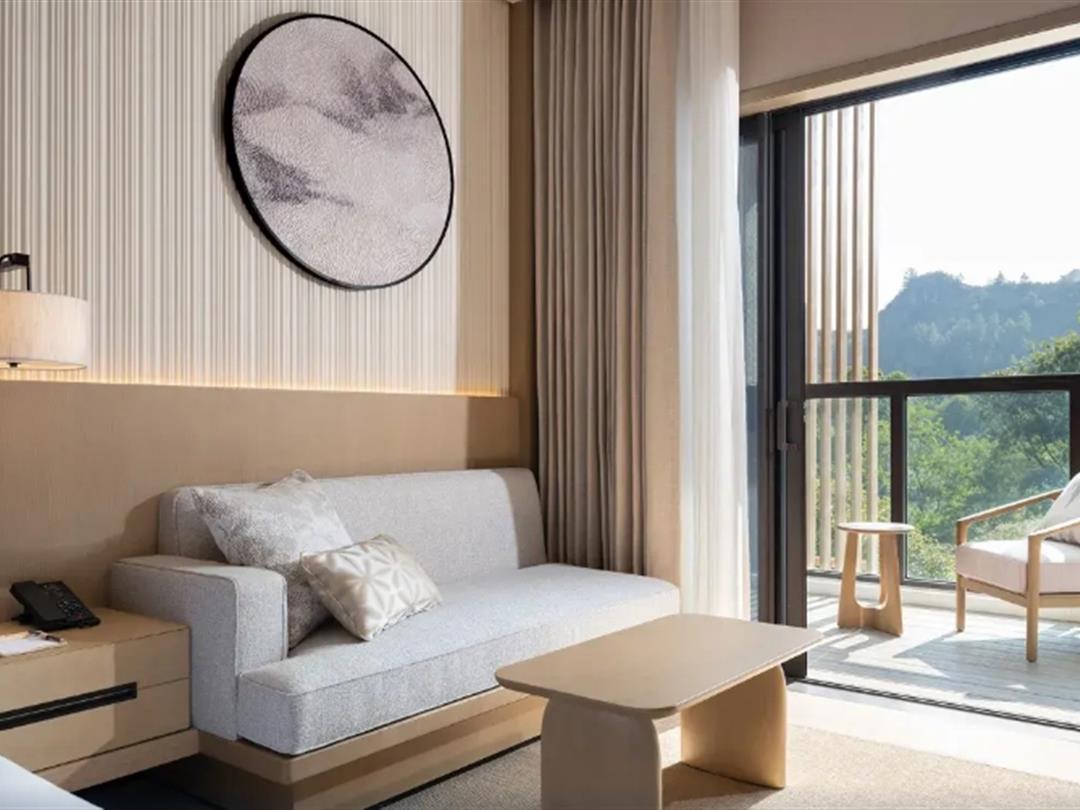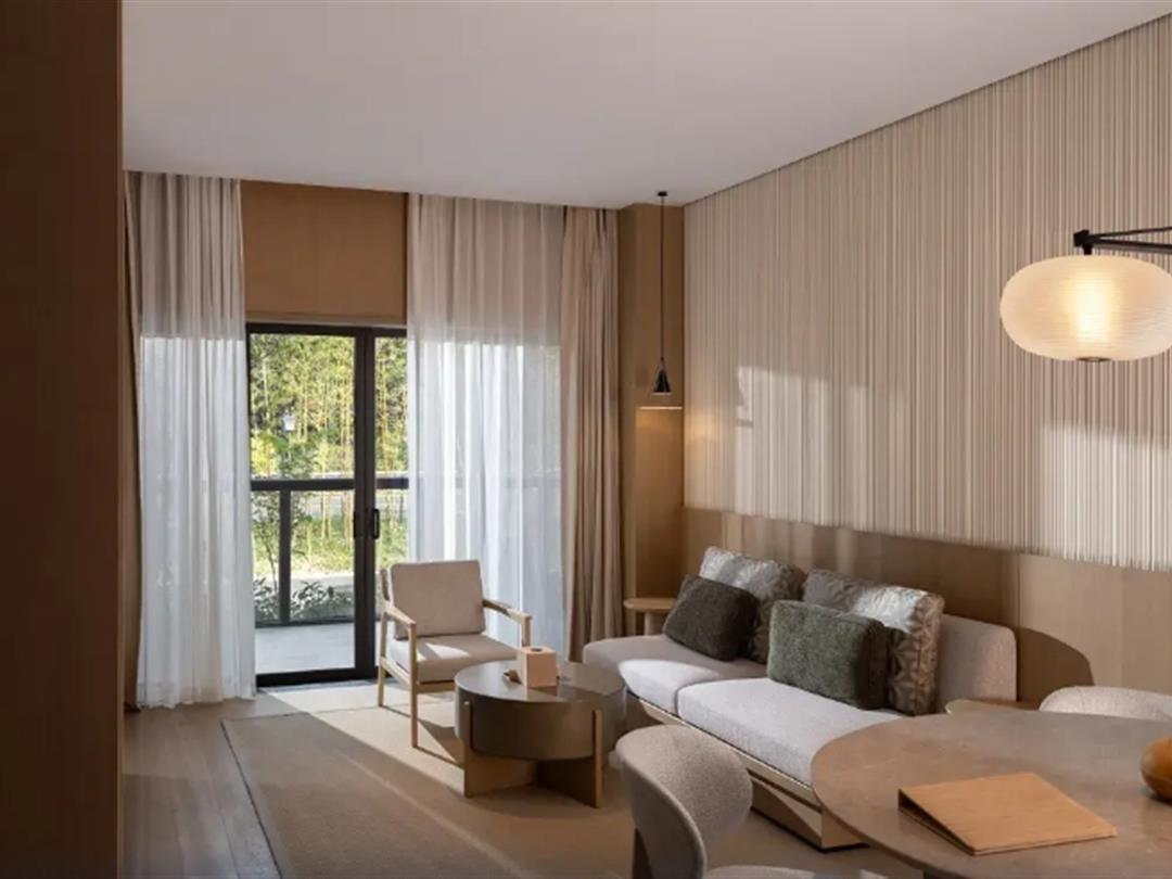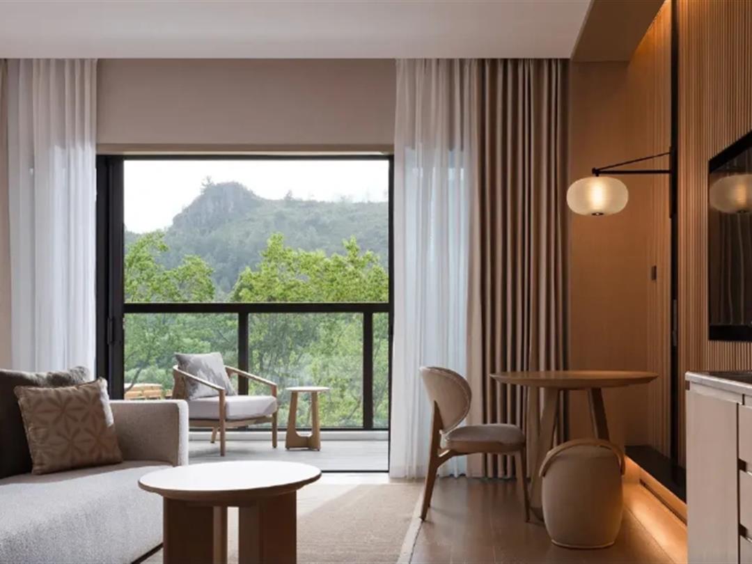 酒店还设计了套房,居停空间更阔绰,如:52㎡悦柳养修隐溪套间、76㎡悦柳养修套房,包含起居室、卧室、大阳台,观景视野更开阔,还配有浴缸。