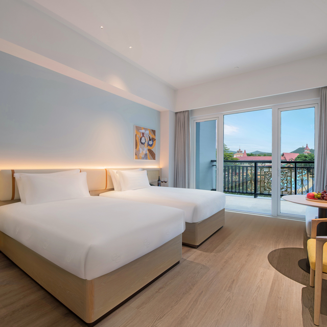 房间用低饱和度的暖色搭配,一进门就能感受到满满温馨感,搭配开阔的落地窗、充足的采光,与窗外度假区童话般的景色,入住体验感很加分。