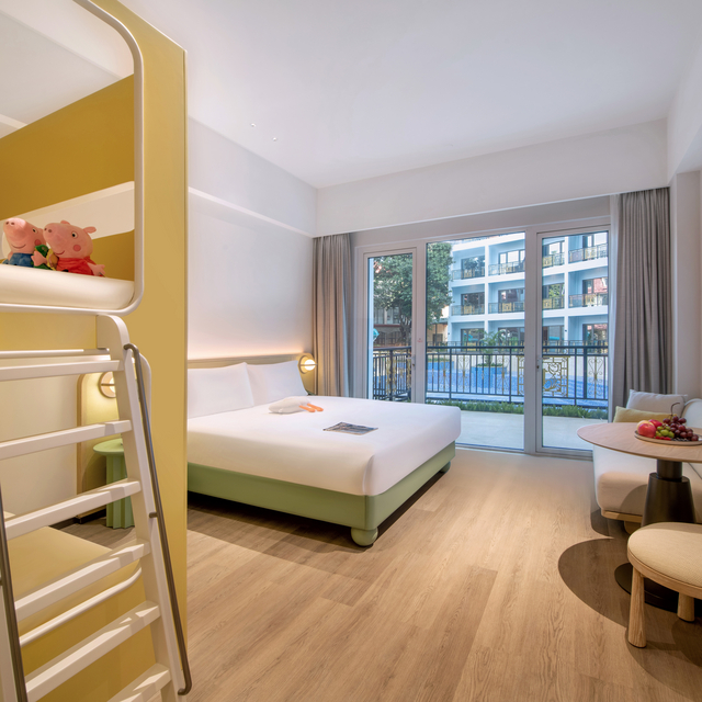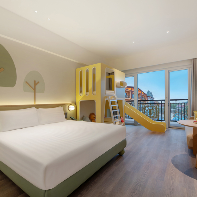 把乐园的滑滑梯直接搬进客房里,奶呼呼的两层小床,可以直接睡下两个小朋友,即使不出门,房间里面好玩指数也太高了!