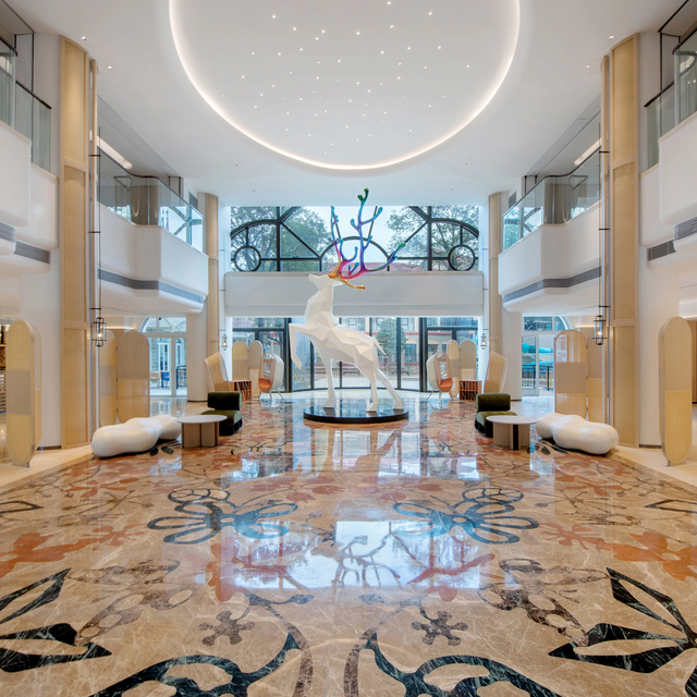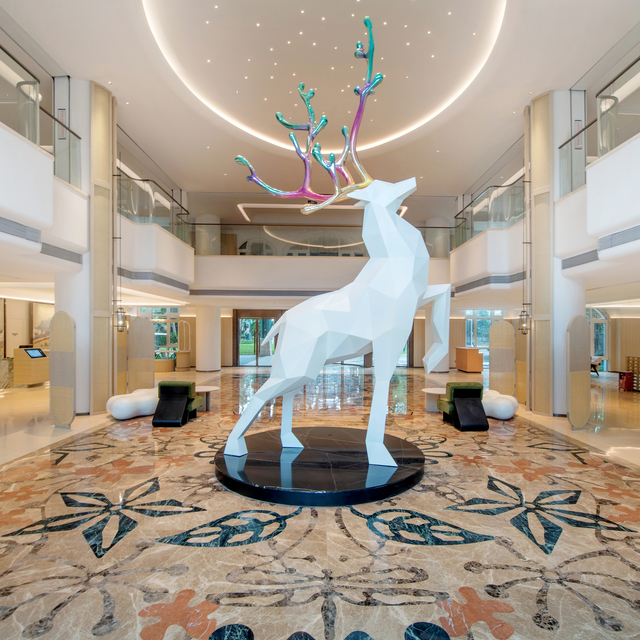 步入大堂,奔腾起步的七彩麋鹿,仿佛从童话故事书里穿越而来,温暖典雅的色调搭配,抬头还有“星光”点点。