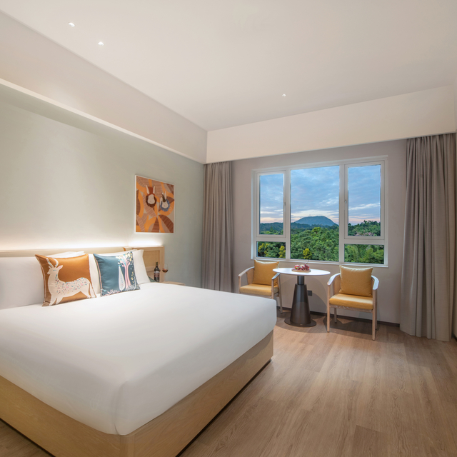 房间用低饱和度的暖色搭配,一进门就能感受到满满温馨感,搭配开阔的落地窗、充足的采光,与窗外度假区童话般的景色,入住体验感很加分。