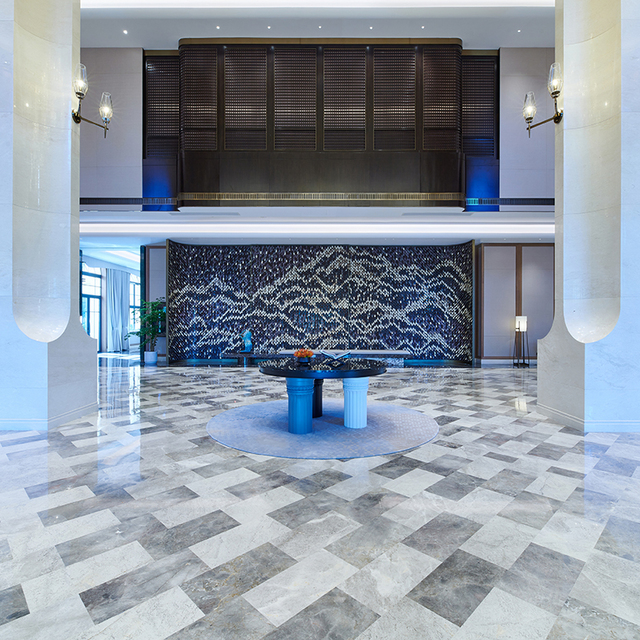 如果说建筑是大气的,那酒店的室内风格,则是欧式典雅与中式婉约的满分融合。海军蓝为主调的装饰艺术,无处不在,尤其是户外中庭的蓝色遮阳伞,很TUI BLUE风。