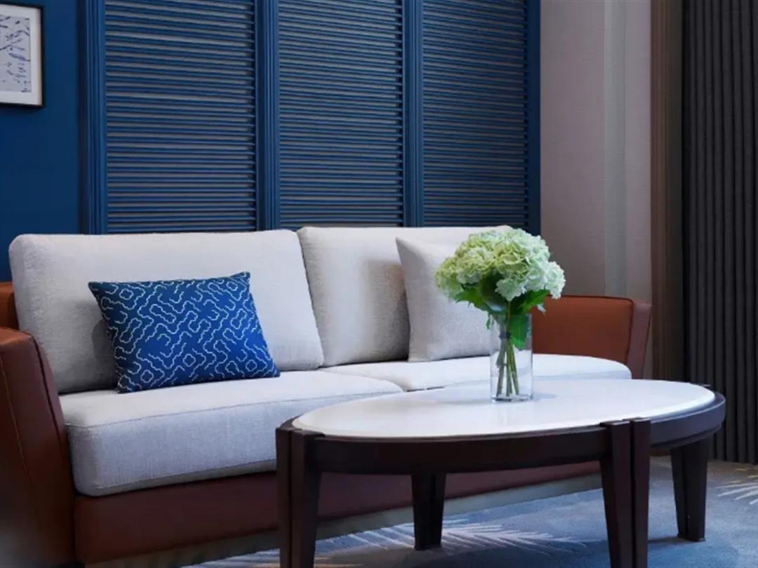 酒店共设有125间典雅舒适的客房与套房,分布在2-5层,不论是走廊,还是门牌色调,都很有设计感。室内运用了大量蓝色和实木家具,从艺术画作到精心挑选的摆件,每处细节都透露着酒店的用心,给人浓烈的度假氛围和时髦气质。
