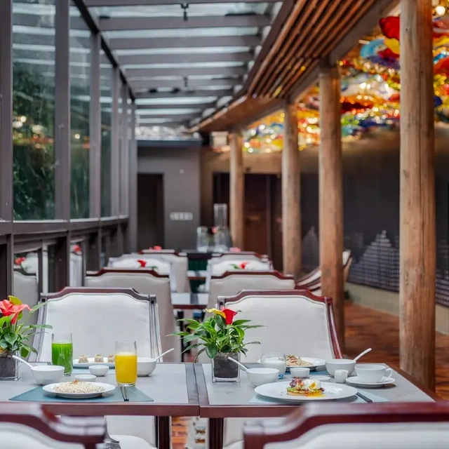 作为酒店的全日制餐厅,餐厅主打传统精髓的闽菜和粤菜,早餐也在此享用,套餐式很丰富,除了富有本地特色的九宫格外,还配有粥品、粗粮、牛奶和果汁。