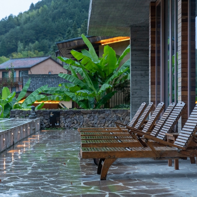 酒店在2000平的榔树村建筑基础赏,创作了一期、二期加起来共166间的客房,每间都是景观房,拉开窗帘就是满眼各种各样的绿色。做旧的木与夯土互相配合,营造出客房外立面返璞归真的原始感。