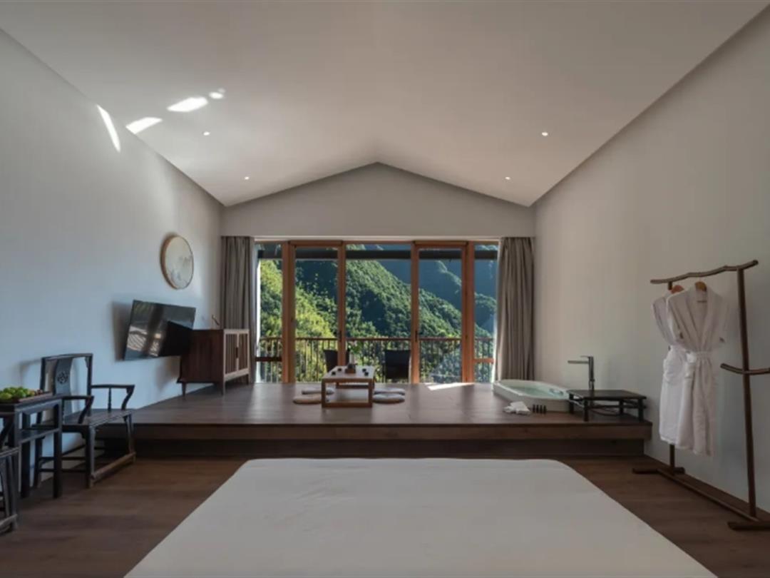 基础房为山景房,面积35-45m²,观景区位置均摆放了桌椅,可供住客,一边品茶放空,一边与友人聊天观景。
