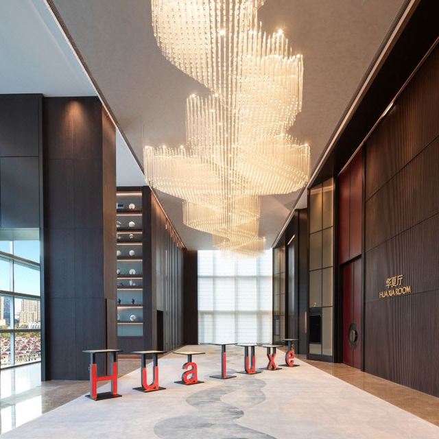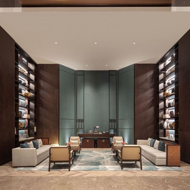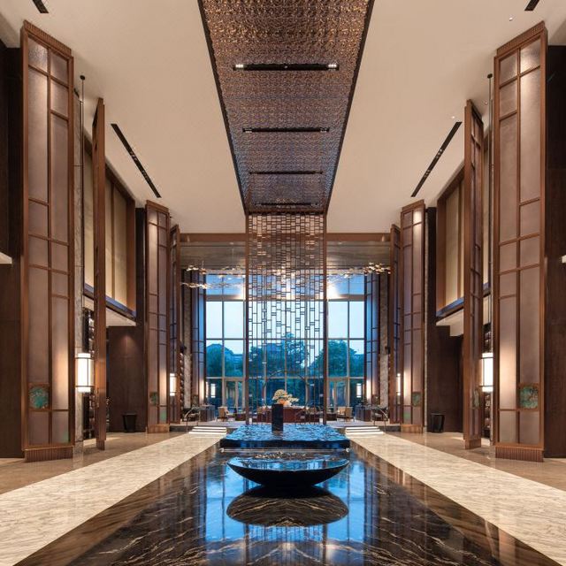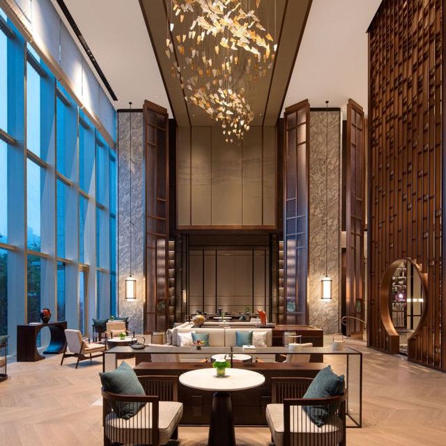 酒店秉承中华美学生活化的理念,以月洞门为主元素,巧妙融入浪潮的涌动,千年皮影戏的神秘光影及硖石灯彩的绚丽光彩,让空间充满古典韵味与现代气息。其中,大堂中心,一幅10米艺术画卷从天而降,恰似“春江潮水连海平”,非常惊艳。
