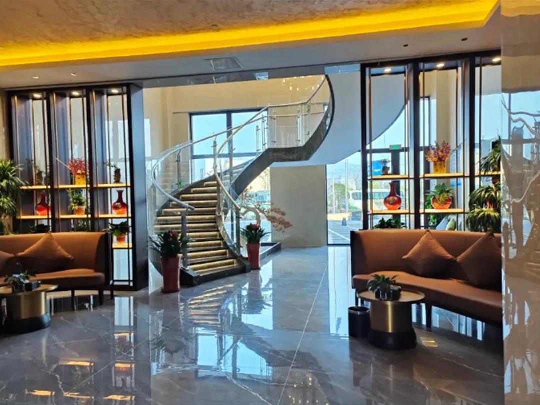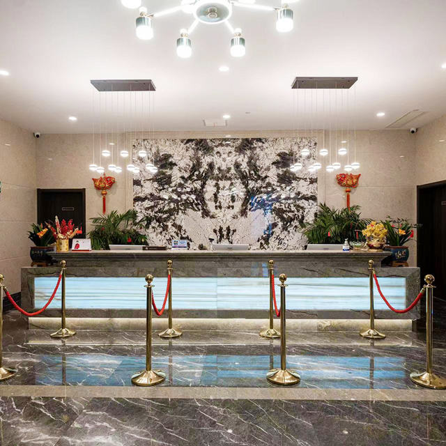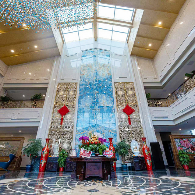 酒店整体建筑为现代中式风格,融入当地特色风貌,走进大堂,迎面便是镂空的金色雕花背景和白玉雕像,三层挑高的高度,给人华贵、大气之感。