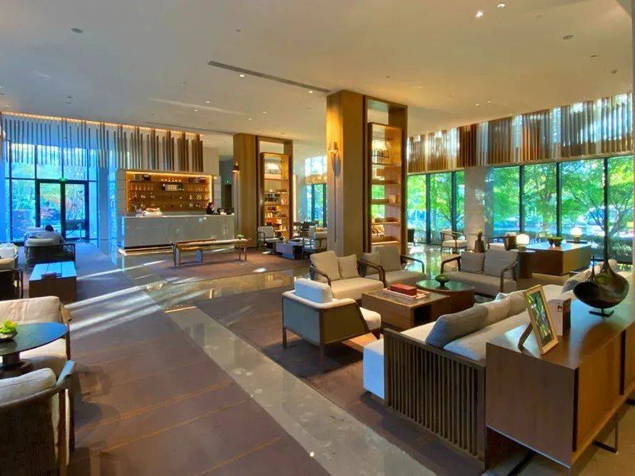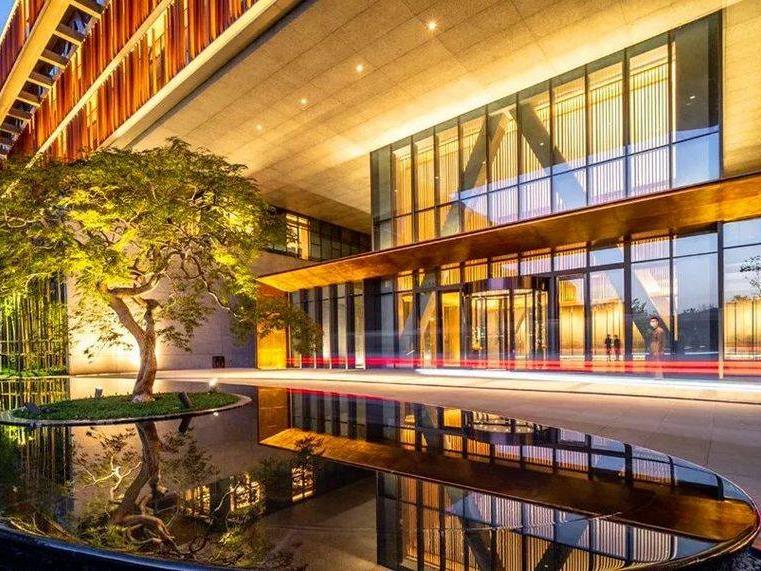 酒店占地面积3.1万㎡,总建筑面积8.1万㎡,由四幢建筑围合而成,并依照绿建三星标准建设。大面积的庭院绿植造景及建设本身的设计,给到人耳目一新的惊艳感。
