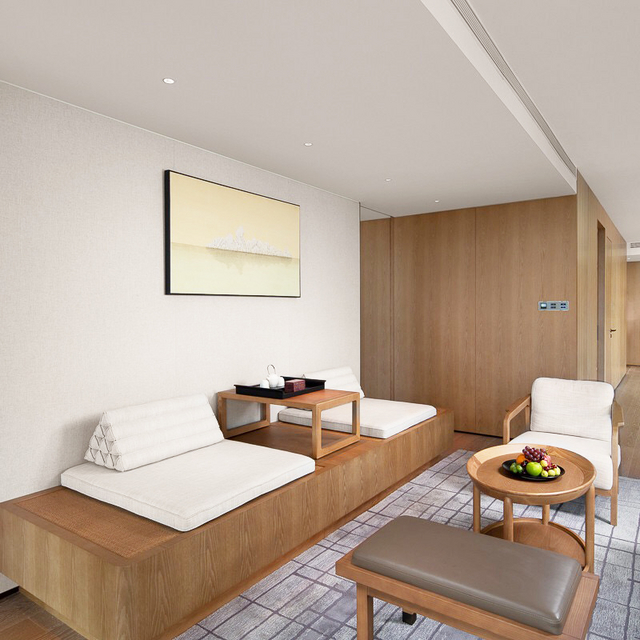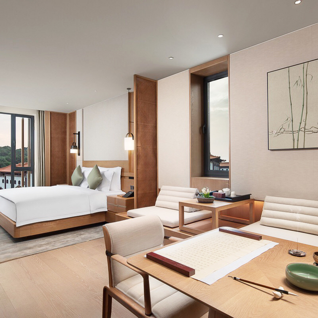 每个房间均设有桌椅,用餐/办公功能兼具;大部分客房设计了日式榻榻米,配备茶具/茶叶,可在此品茗、静心打坐;设外延式景观阳台,足不出户即可饱览庭院绿意风光。(不同季节时令提供不同茶叶,遵循五季自然循环)