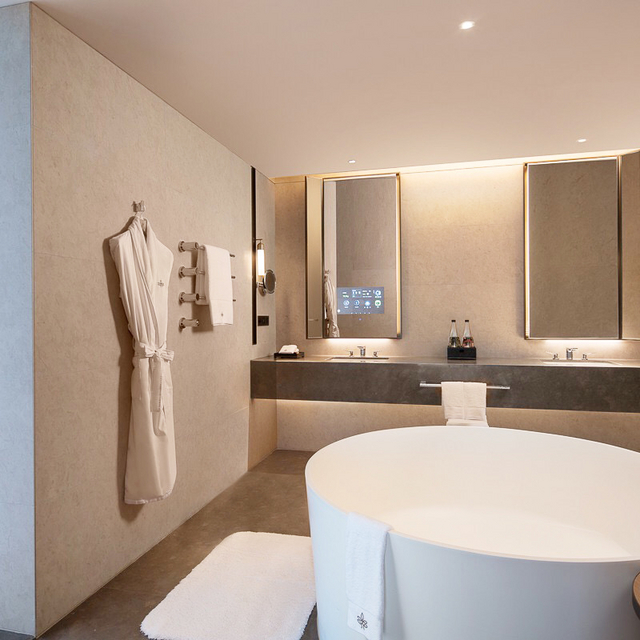 卫浴空间也是藏着不少小心思哦:双台盆洗漱台(大部分客房配备)、大浴缸、洗浴用品臻选澳洲高端植物精油品牌Appelles、硅藻泥地垫、体脂秤,马桶是德国品牌杜拉维特。(携带儿童入住,致电前台,可提供儿童拖鞋/牙刷/浴袍)
