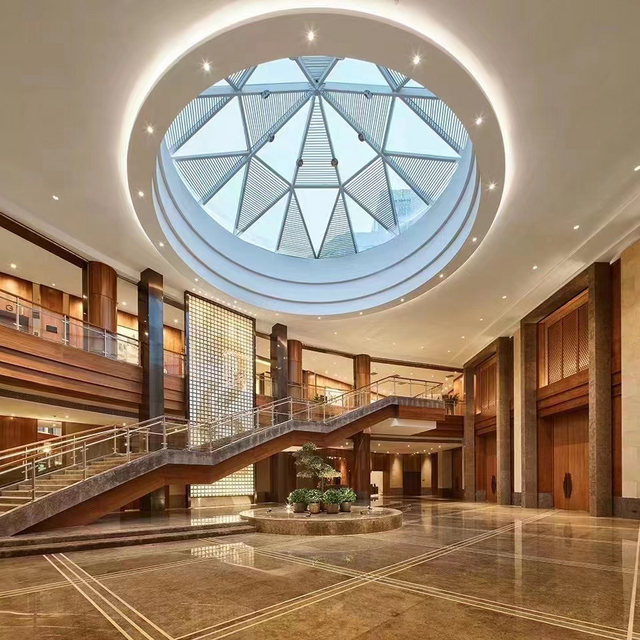 大堂正中的圆形玻璃穹顶的设计颇有新意,引自然采光入内,光阴变幻,流动在古色古香里,让空间多了几分灵动。