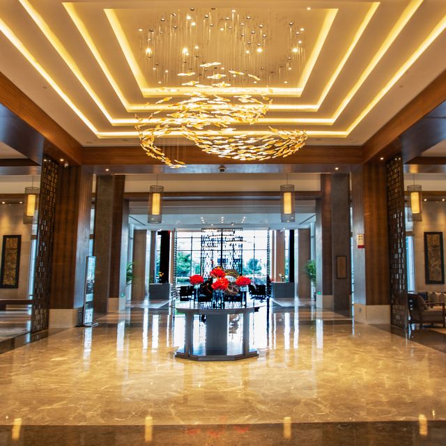 在室内设计上,酒店没有刻意追求标新立异的现代感,取而代之的,是以木质色调作为主色,佐以大理石光洁自然的纹路,营造沉稳典雅的空间。充满东方韵味的松柏、回廊、灯笼、木门、雕花等元素,穿插其间,从跨入大门的那刻开始,便让人沉浸在古典雅致之中。