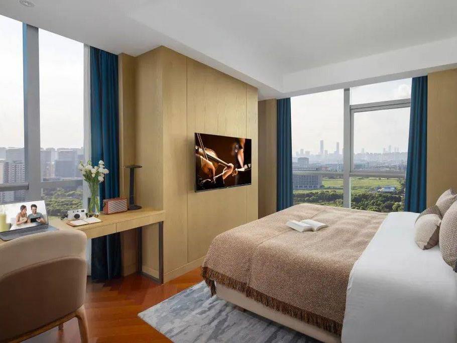 公寓东临京杭大运河,南接美丽的太湖,因此在部分客房内,天气好时,还能远眺太湖风光。整个公寓拥有185间客房及套房,分布在5-23层,每间都拥有落地玻璃设计,可以包揽酒店周边都市风光。