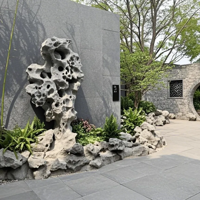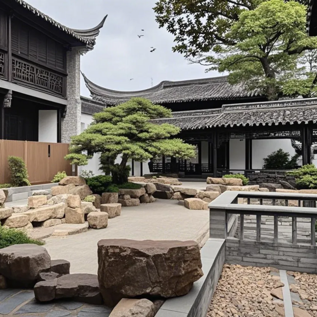 主院用的是旱院水作(扬州传统造园手法),不用真的水,而是堆土山、设缓坡,做出山溪、瀑布、河流的样子;地面用青瓦、卵石铺成波浪、漩涡图案,象征水流,在月光下能营造出有水的感觉。