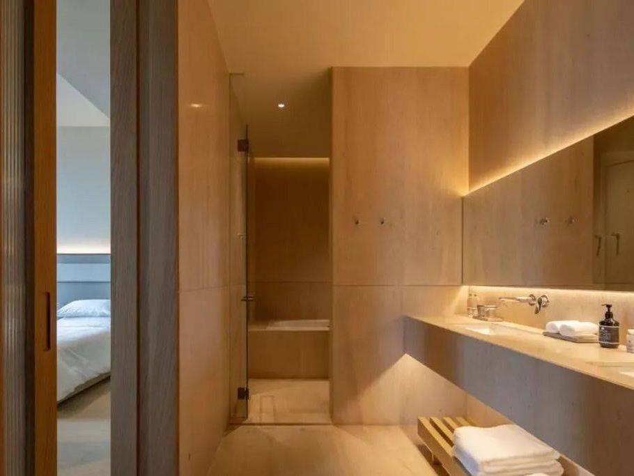 设计了客厅、睡眠区及干湿分离的洗漱区,还设计了嵌入式的浴缸,摆放着戴森吹风机、有熊洗漱包、JBL蓝牙音响,沙发桌椅灯饰的搭配,让整个套房,有了杂志画报的氛围,格调拉满。