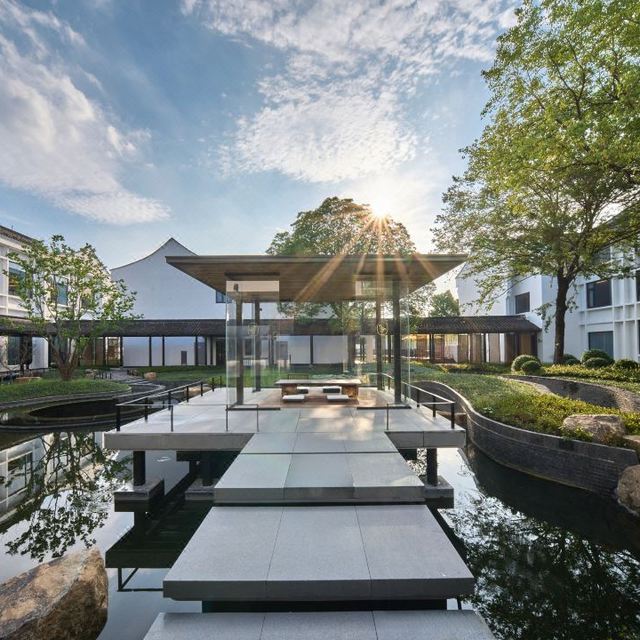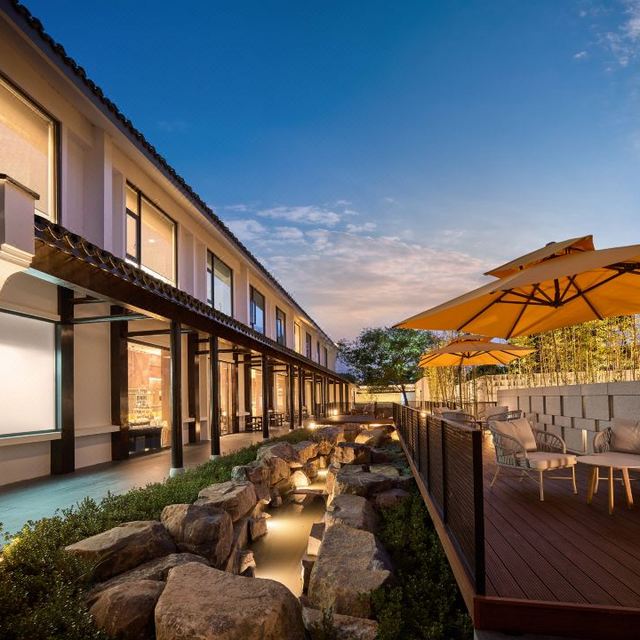 酒店还打造一方意境十足的庭院景观,流水倒映着亭台楼阁、绿树繁花...宛如一幅画卷。