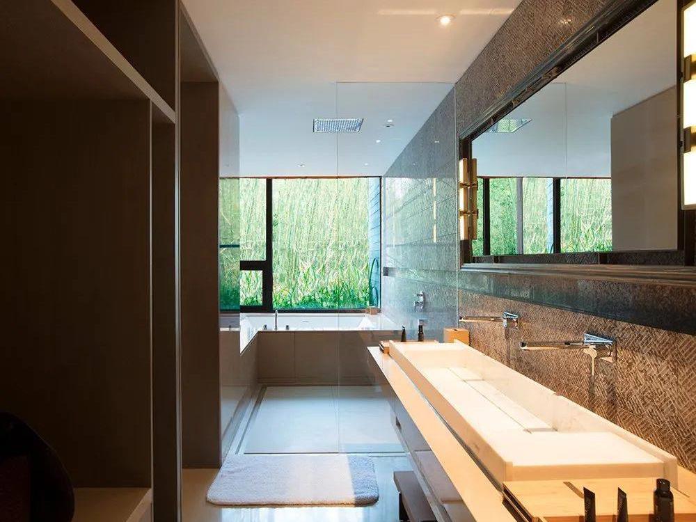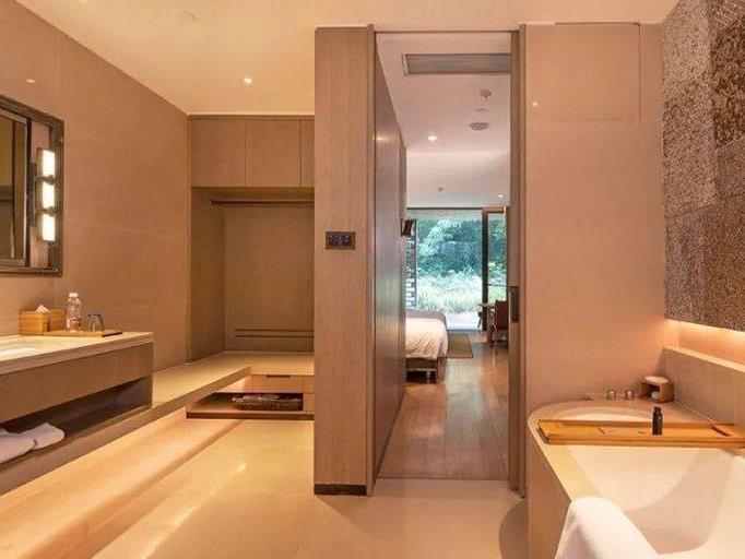 糖舍山居正对山谷,自带景观阳台,推门见景,躺着、坐着,都是画;起床时伴着鸟声和风声,更有意境。为了让视觉感更干净,客房内的很多单品都被“藏”了起来,灯具,插线板在木头中,一些列用品在柜子与抽屉中…再看电视背景墙,虽“不起眼”,但专门保留了纹理深刻的老木头;浴室梳妆墙面更由水磨石拼接而成。