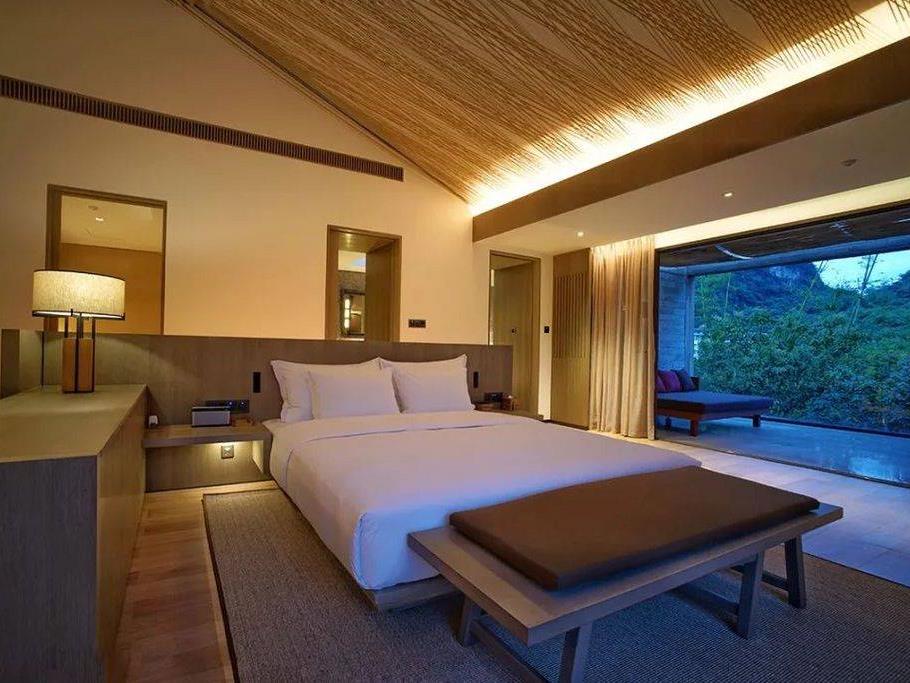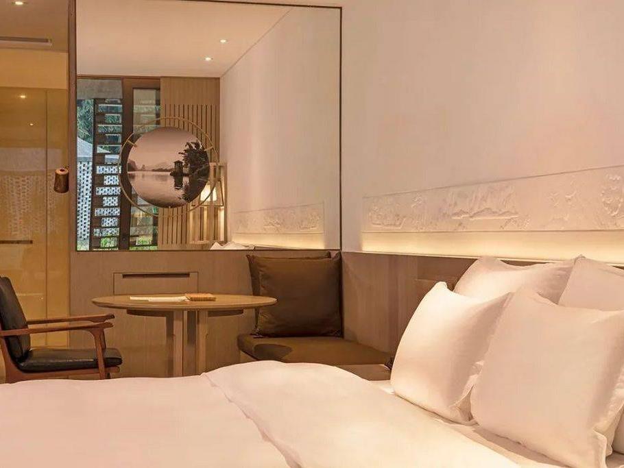 新楼建筑融合了喀斯特地貌,公区以竹为元素,还模拟了喀斯特溶洞特征。房间是原木色和工业风的结合,温柔不失质感,光线透过不同样式的传统画窗,散发出多样视觉效果。