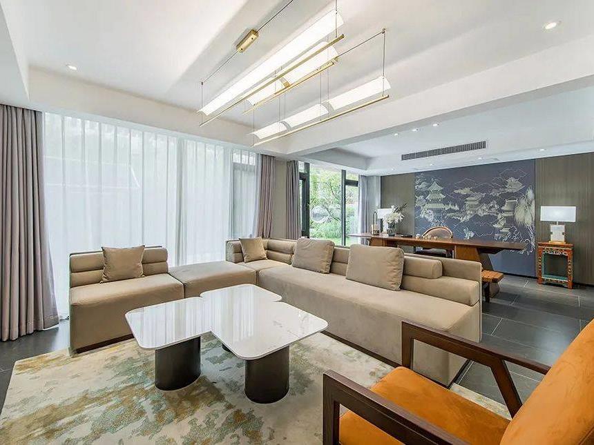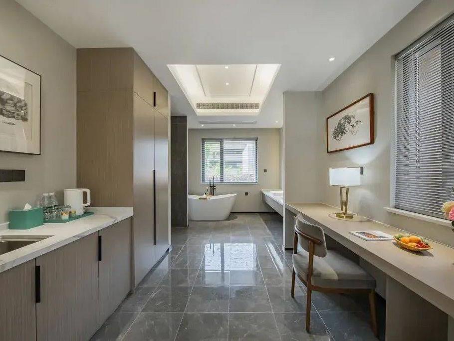酒店16栋独栋别墅共设六十余间客房,从室内装饰到布局都很符合当代人的审美。大部分别墅一层都是公区大客厅,坐在这里喝茶、读书,很是惬意。(注:不同别墅公区布局不一)