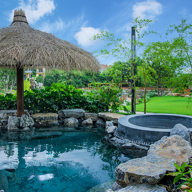 每栋建筑之间,也都是不同的养眼景观。门庭前的枯山水,庭院中的园林、池塘、假山……真可谓是步步为景,让你切身感受到度假的舒适惬意。