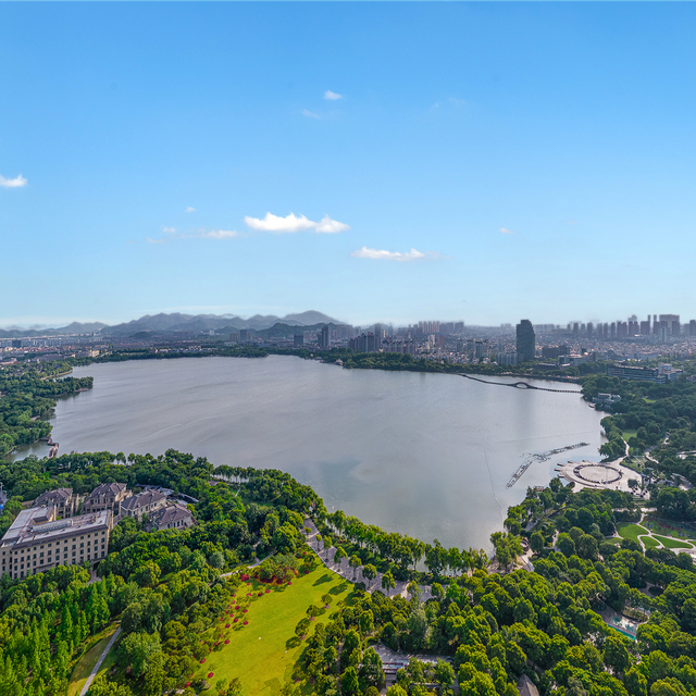 酒店在柯桥区群贤路与湖东路交叉口,一路之隔就是"水乡明珠"瓜渚湖,身居高楼层客房,就能将湖岸全景连同瓜渚湖公园一起尽览无余。
