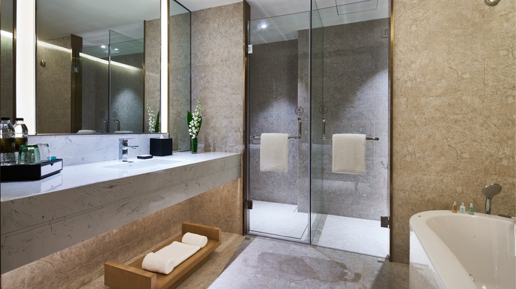 铂骊套房面积宽敞,部分房型设有独立观景阳台。室内采用低饱和度的莫兰迪色系,搭配融入浦江两岸地标元素的装饰画,营造出宁静雅致的空间氛围。