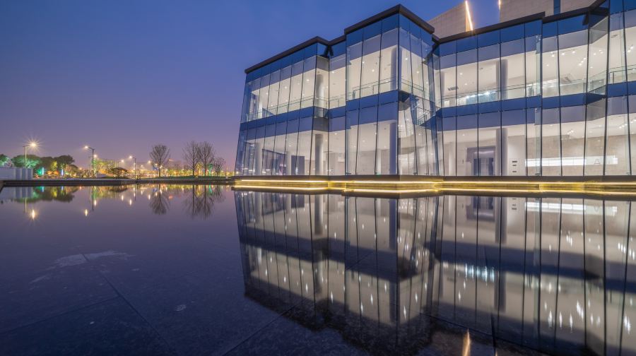 博物馆看似由多个空间进行组合,实则连为一体,从高空俯瞰就像一个大写的“吴”字,契合了吴文化的主题。钢筋水泥的坚硬外表与简洁明快的节奏调性,呈现给观众一种简单的“纯粹”。置身于极简的灰调空间之中,由建筑本体而生的张力,全在方寸之间。晴朗的清晨与傍晚,透过天窗洒向博物馆地面与墙面的阳光,便成了舞蹈着的精灵。夜色撩人灯火温柔时,两层高巨大的玻璃幕墙仿佛一块闪闪发光的钻石镶嵌在浅池之中。从二楼的咖啡吧观景台远眺宝带桥,伴着咖啡香来一场博物馆之旅,漫步巨大的灰白色楼梯,拍一张与博物馆邂逅的合影,惬意而美好。