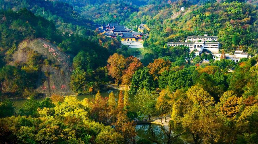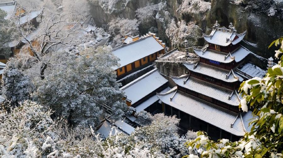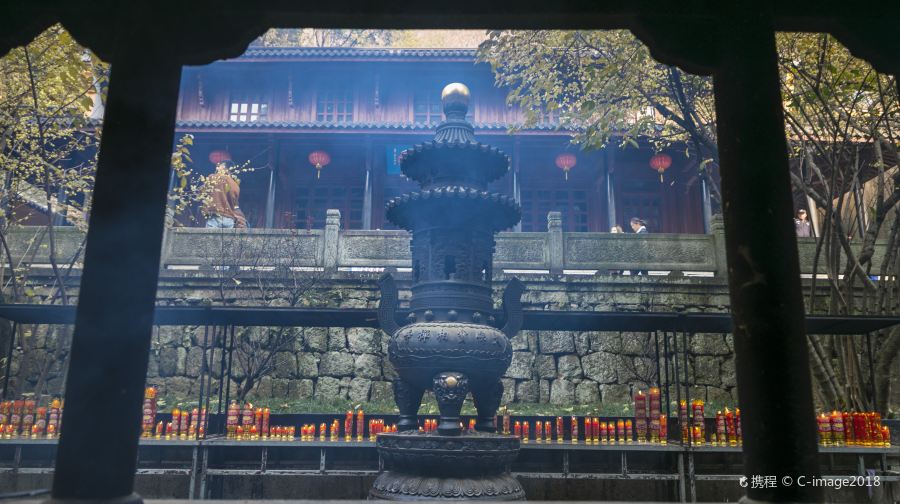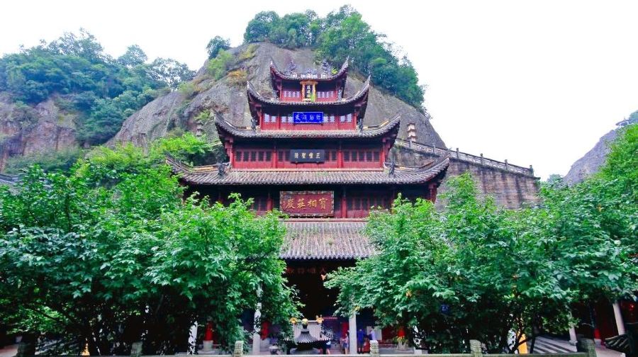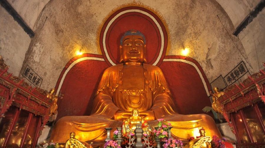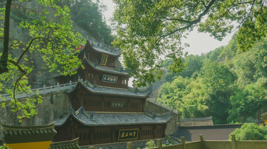 令人惊叹的是,它外面五层的木结构建筑和里面的石窟完美融合在一起,里面供奉着一尊高达16米的石弥勒像。塑像开凿于南朝,金碧辉煌,是江南早期石窟大佛,被誉为“江南第一大佛”,比四川的乐山大佛还早200年。大佛殿一旁的放生池边,有始建于隋朝的智者大师纪念塔。