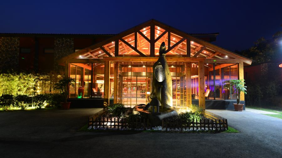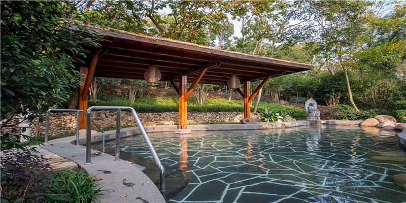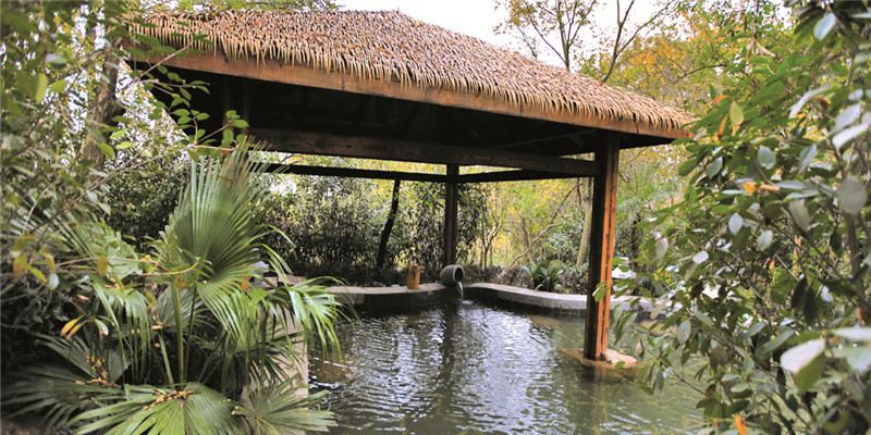 温泉区内草顶木构泉屋、异域风情茶吧、自然景观SPA房、石磨盘小径、雾气流水墙,处处匠心独运,将自然环境与人性时尚有机结合。独特的是:在浸泡温泉时同池可观赏保护动物扬子鳄的生活动态;还有可享受浸泡温泉潇洒挥杆打高尔夫的乐趣。头顶苍穹,身沐地泉,绿树环抱,天人共和。