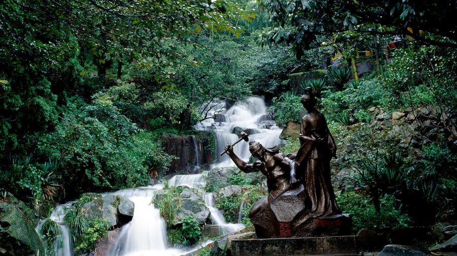 从荫山街出发,走下坡路便到了剑池,这里是景区的瀑布群,剑池可能比想象中袖珍些,但竹林和瀑布很是清凉。池边有一尊干将、莫邪铸剑的铜雕,是莫干山的标志,游人来这儿总不忘拍张照。