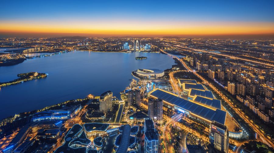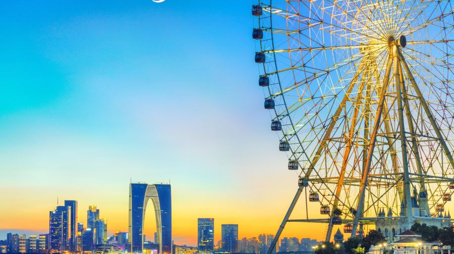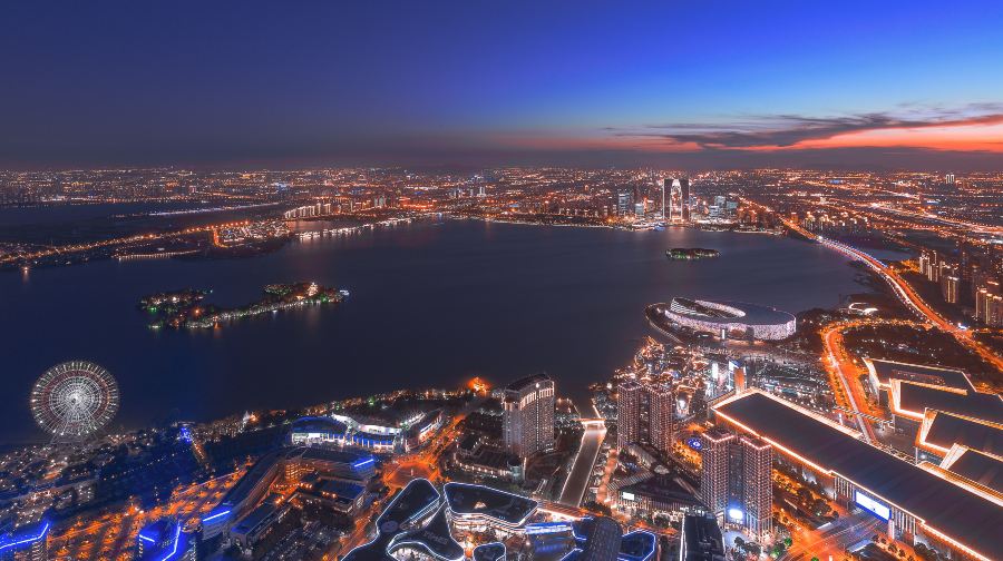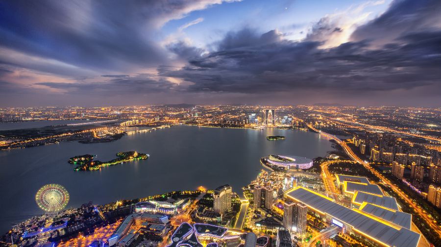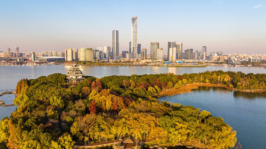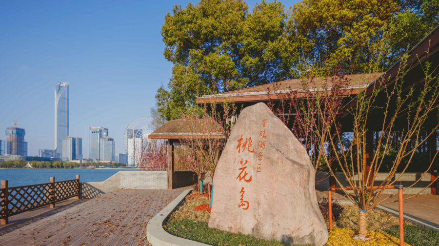 金鸡湖位于苏州工业园区,相比古色古香的古城区,这里的高楼林立与现代化展现了苏州的另一面。金鸡湖面积比杭州西湖稍大,每天都有很多游客前来湖畔休闲散步或是购物、吃美食,新人们也喜欢来此拍摄结婚照。景区有四个入口,是一个开放式的公园,从哪一个入口进入都可以。一般游客游览起来都会从西入口进入,入口附近就有地铁,可以看到苏州的新地标东方之门摩天大楼,俗称“大裤衩”。地铁口出来就有自行车租赁点,要是想骑车环湖的话,在这里就可以租借自行车了。西入口进来就是湖滨新天地,是湖滨大道的入口处。这里有亲水宜人的木质走廊,大道旁竖立着很多仿真人的艺术铜像,天气好的时候,可以看到很多人在这里跑步或者骑行。湖边的草地适合野餐、烧烤、放风筝。你还可以看到矗立在湖畔的“圆融”雕塑。另外,如果时间够充裕的话还可以从湖西望湖阁码头购买船票到金鸡湖景区湖心的桃花岛上去看看,每逢桃花盛开的季节,整个桃花岛上嫣红漫天。游玩了西入口之后你可以步行或者在望湖阁码头乘坐水上巴士到李公堤码头,李公堤是苏州金鸡湖中仅有的湖中长堤,保留了传统的苏州民居建筑形态,你可以漫步李公堤国际风情商业水街,看到国外品牌和国内传统店铺都开设在这里。或者你也可以在风情街上乘坐免费(节假日可能额外收费)小火车游览这个区域的景观,如基金博物馆、极限运动场地、湖心亭、凌云桥和李超琼诗碑等。如果是情侣或者带儿童来游玩的话,你也可以直接在望湖阁码头乘坐水上巴士前往对面的月光码头,或直接从景区的北入口进入,入口处就是现代休闲广场,那里有“苏州鸟巢”之称的苏州文化艺术中心,连接红枫林景观和苏州国际博览中心,内有大剧院、电影城、演艺厅等。你可以在这里拍照留念或者进入文化中心内部看一场3D电影。喜欢玩游乐项目的可以步行前往摩天轮乐园,园内的建筑都是仿欧式的,你可以坐上摩天轮,俯瞰整个湖景,另外,这里还有悬挂式过山车、卡丁车等,都非常值得一玩。当然尽量避免节假日前来游玩,排队坐摩天轮的人会很多。游玩了白天的这些项目之后,金鸡湖的夜景也是不容错过的。你可以付费乘坐晚上从湖东月光码头或湖西望湖阁码头发出的游船,整个行程耗时40分钟左右,沿途上会经过白天游览的一些景点。此外,夜幕下的金鸡湖景区大桥也不容错过,利用数码灯光等高科技手段制作出来的五彩数码瀑布从桥上飞流而下,“流动”时还会呈现不同的图案和文字,成为景区夜晚一道靓丽的风景。住宿环湖有豪华舒适的高端酒店,如苏州中茵皇冠假日酒店,莅临湖上,在酒店房间内就可以欣赏到景区美景,地铁1号线东方之门站4号出口,与现代大道交汇处。还有温馨实惠的经济型酒店,如锦江之星或桔子酒店等。餐饮和购物湖滨新天地和月光码头边有很多临湖而建的餐馆、咖啡店和酒吧,常见的星巴克、酷圣石、大鱼铁板烧、上海人家等都可以在这里看到。如果乘坐地铁1号线直接到时代广场站出来,还可以去圆融时代广场和旁边的久光百货逛逛,里面不仅有餐馆、购物店,还有小朋友喜欢的ToysRUs玩具反斗城和卡通尼乐园。另外,这里圆融天幕,全长约500米、宽32米,离地面21米高。巨型LED天幕横穿整个圆融时代广场,其长度超过美国拉斯维加斯天幕的长度。每晚定时开启,你可以看到硕大的荷叶在头顶绽放,五彩的鱼从头顶游过。