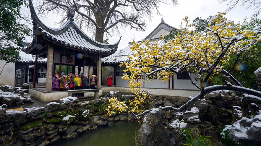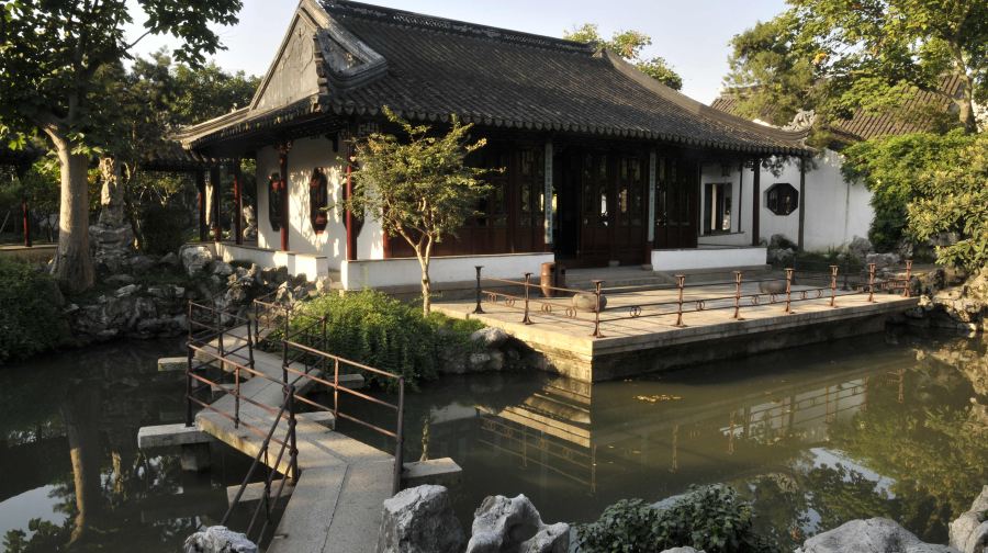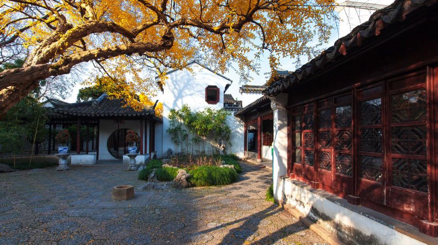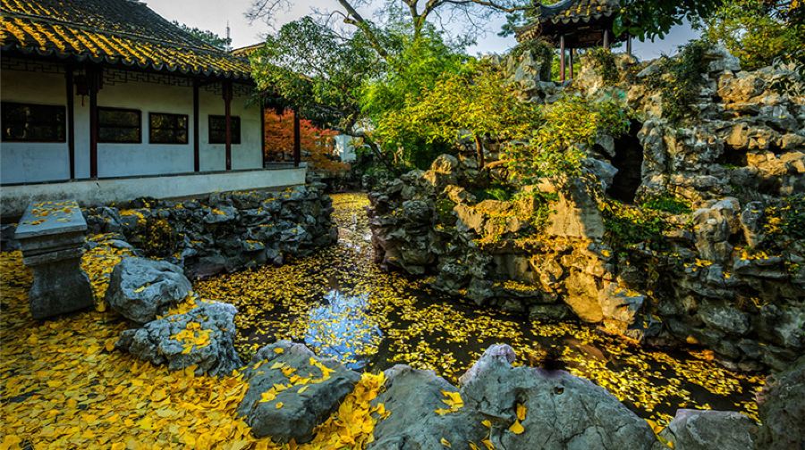 怡园是清光绪年间富绅顾文彬所建的私人花园,在苏州园林中建造晚,得以博采诸园之长,形成其集锦式的特点,由于其布局紧凑,手法得宜,有较高的观赏价值。怡园面积约九亩,东西狭长。园景因地制宜分为东西两部,中以复廊相隔,廊壁花窗,沟通东西景色,得以增加景深。廊东以庭院建筑为主,曲廊环绕亭院,缀以花木石峰,从曲廊空窗望去皆成意蕴丰富的国画。廊西为全园主景区,池水居中,环以假山、花木及建筑。中部水面聚集,东西两端狭长,并建曲桥、水门,以示池水回环、涓涓不尽之意。池北假山,全用优美湖石堆叠,山虽不高而有峰峦洞谷,与树木山亭相映。主要厅堂藕香榭,为一座鸳鸯厅式的四面厅。北临池水,南向庭院,右为小桥流水,左右有亭轩洞壑,由此可至西部各景区。东西两部还有历代名人书画条石数十方,可供观摩欣赏,人称“怡园法帖”。