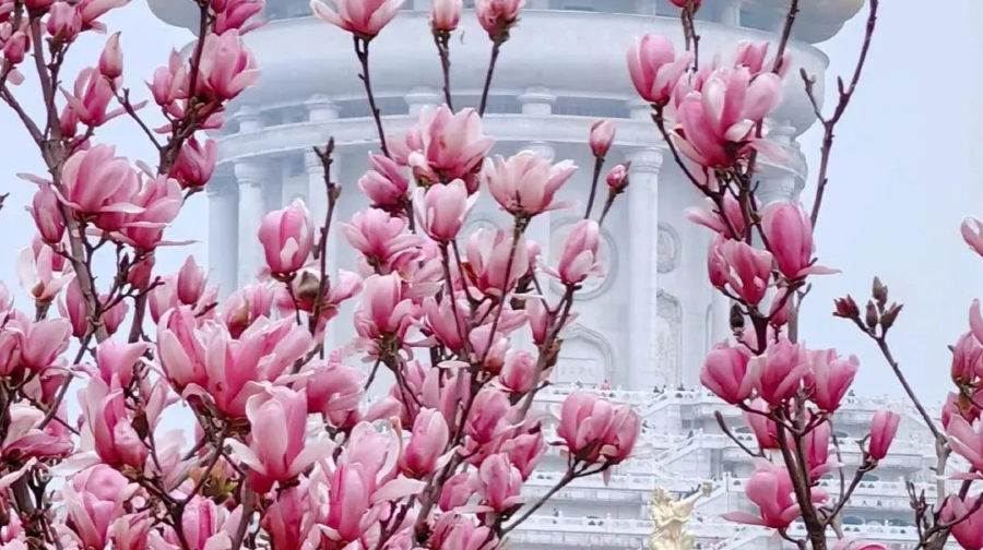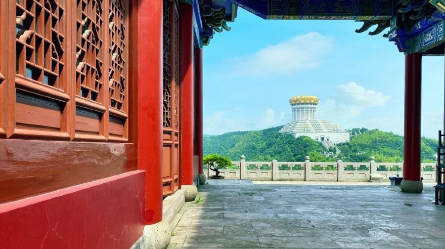 其中,粉墙黛瓦的江南民居风楼阁群,与红墙琉璃瓦组成的寺院群有着完美的搭配,一步一景,美轮美奂,彰显了二十一世纪佛教寺院的建筑典范。