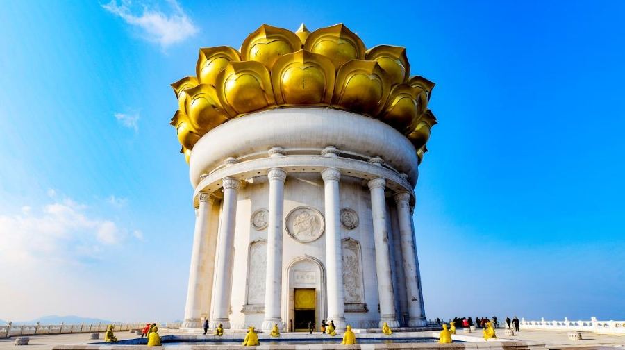莲花上供奉着无相大佛,契合了《金刚经》“不可以身相得见如来”之意。夜间的,更是虚无缥缈,如梦如幻,七彩变化的灯光,让人如入天宫幻境,再现了佛经中“莲花上有无量亿光”的迷人景象。