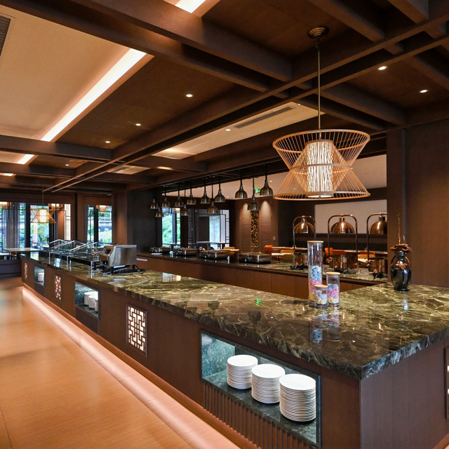 全日制餐厅--湖畔时光餐厅,有一侧面向酒店园林,一侧面向千岛湖 ,自助早餐有中西式可选,也有千岛湖当地特色美食。
