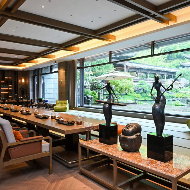 酒店大堂吧--观澜雅韵吧,直面酒店园林风光,摆放着一张长达8米的胡桃木打造的红宝石茶台,可以和家人在这里品味咖啡和中西式下午茶。