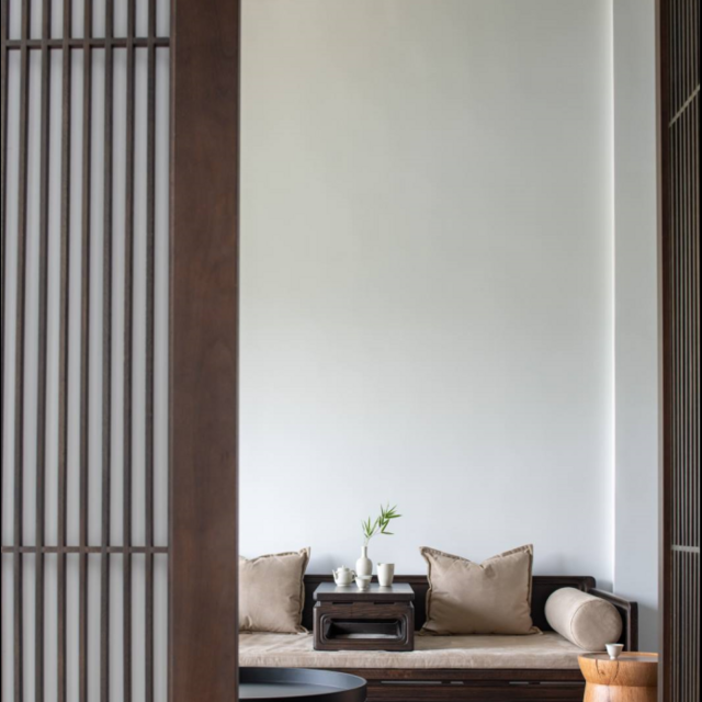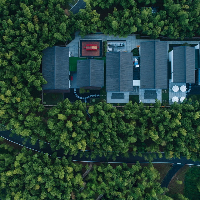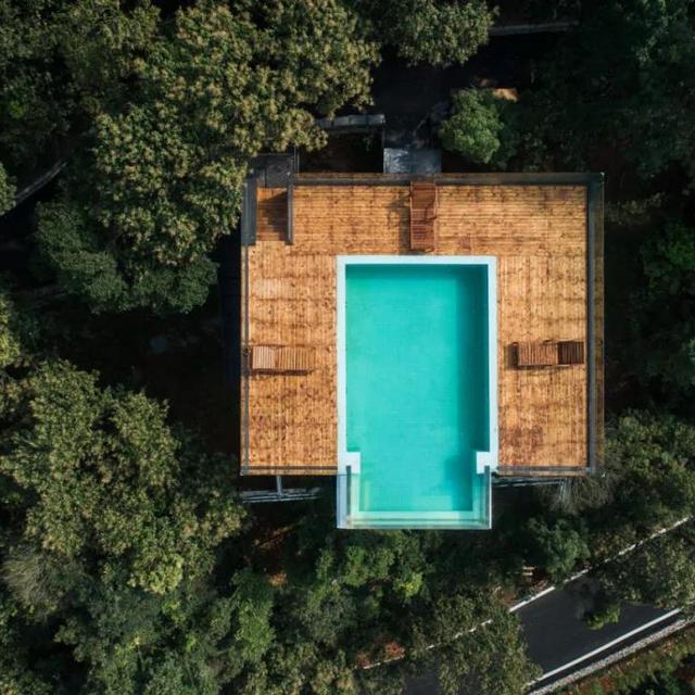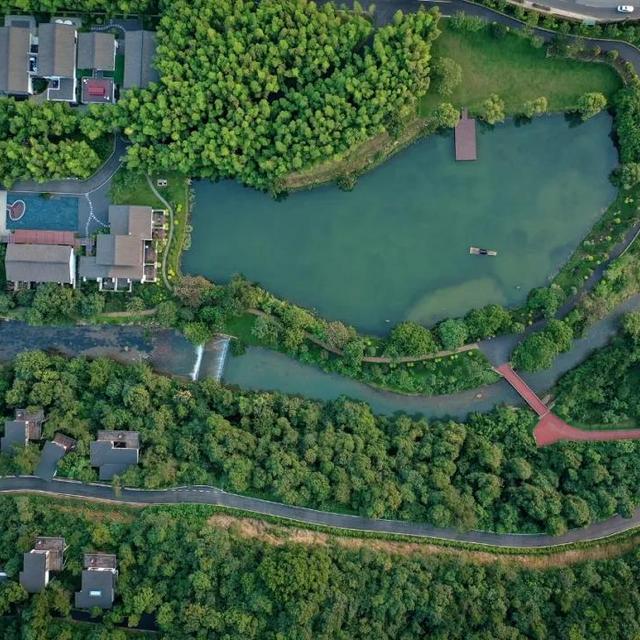 亲水雅院围绕着一座室外泳池而建,被湖、河、竹海三景围绕,由庭院式的回廊链接,共享一处月亮门前的休闲区,泳池内的下沉式空间,更能拍出不俗美图。客房内能赏竹海美景,能步行至泳池、湖泊与河流边。