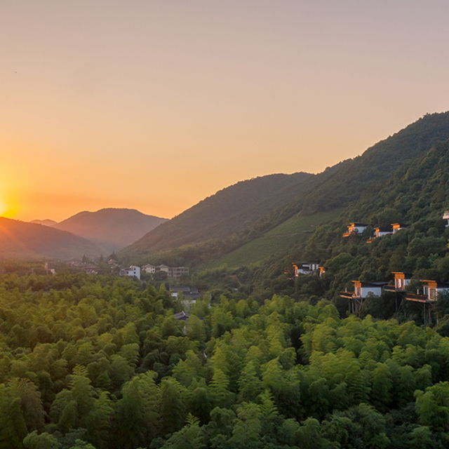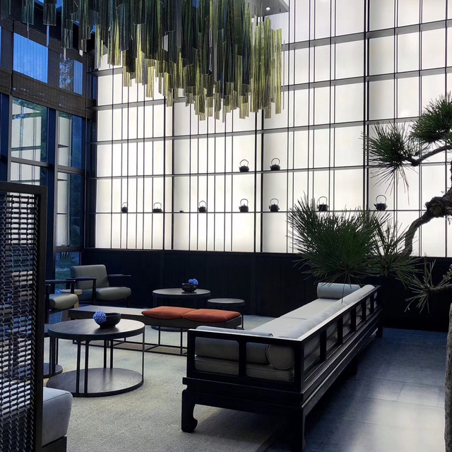 设计,与景共生;细节,都源自山野林间。前台名为客至,屋外拥有镜面墙,将竹海与天空框入其中,堪比一幅24小时都在变换的画作;大堂内的竹片灯饰,随风摆动,清新脱俗。