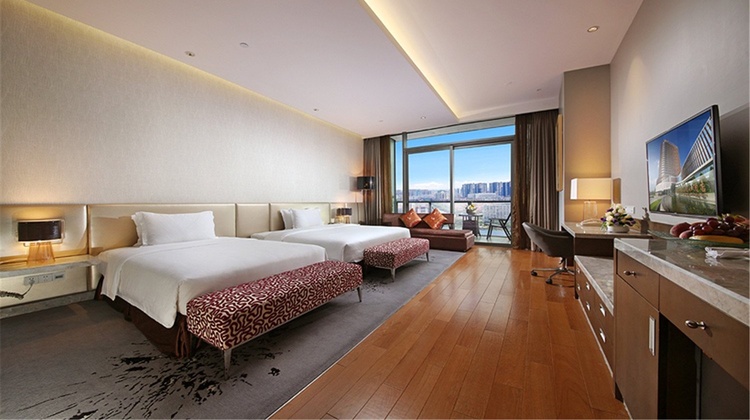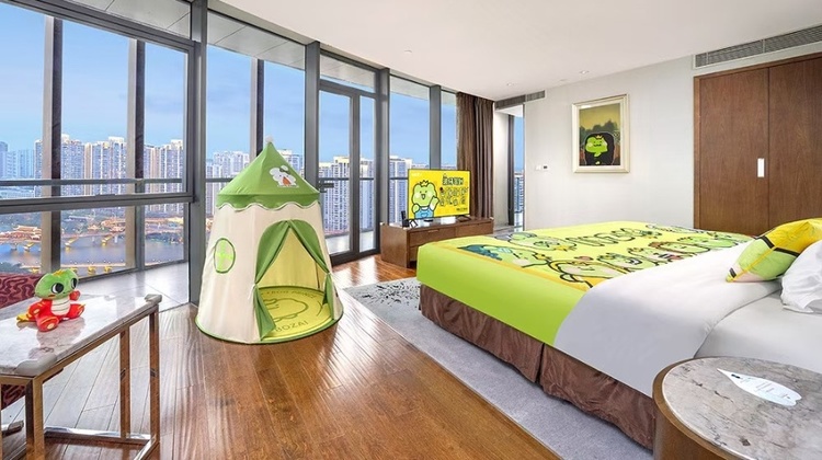 酒店占地55000㎡,共有331间超豪华客房,面积60㎡起跳的家庭房,位于酒店的5-17层,房间内有1张双人床1.35米,和一张2米的大床,一家三口入住,空间也很宽敞,小朋友尽情翻滚,太舒坦了吧。