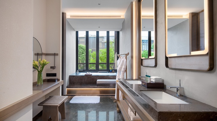 客房内部设计以含蓄的手法演绎宋人极简的雅致风格,白色、青釉色的底色配以山水、花鸟壁画,仿宋代特色的瓷器、木器,在返璞归真中营造清远高旷的意境。