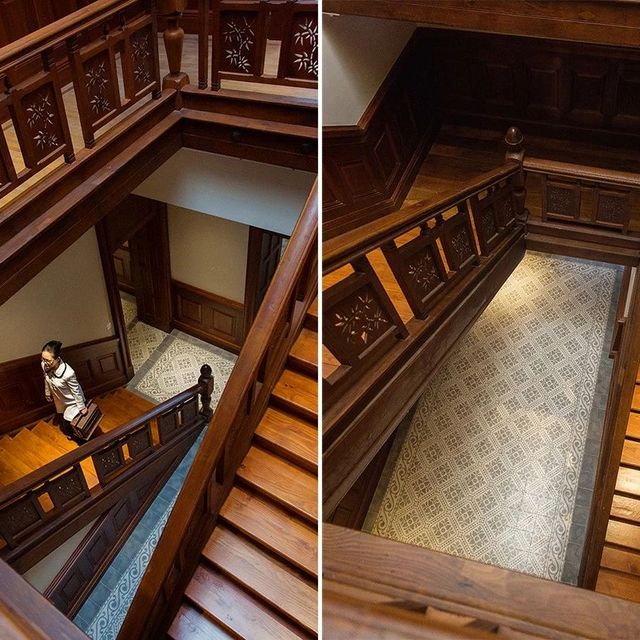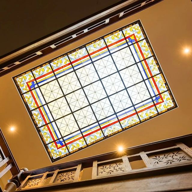 小心翼翼地走在桃花心木的楼梯上,抬头可见彩绘玻璃天花,低头是历史打磨出的痕迹,在光线投射下复古而绚烂,如果你恰好穿一身旗袍,那真的是梦回民国!