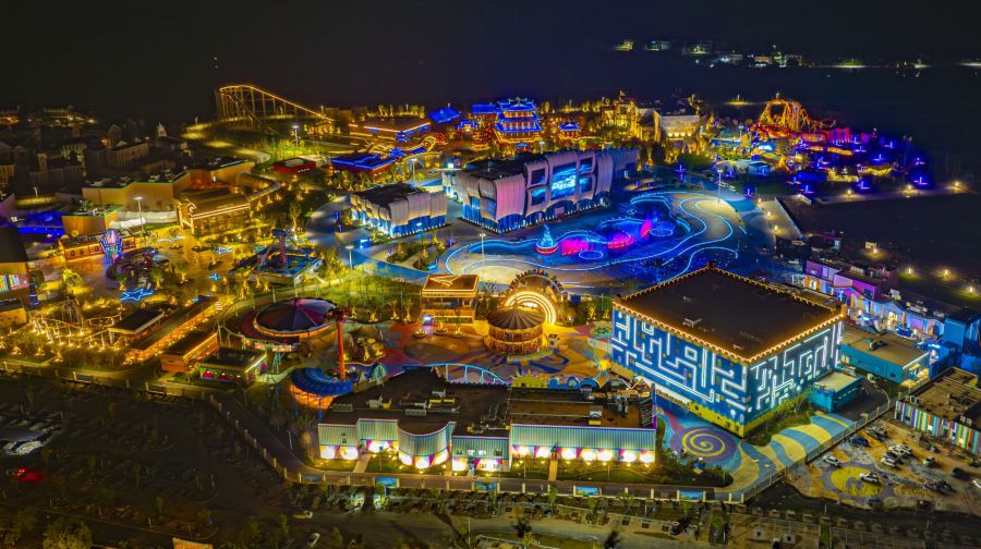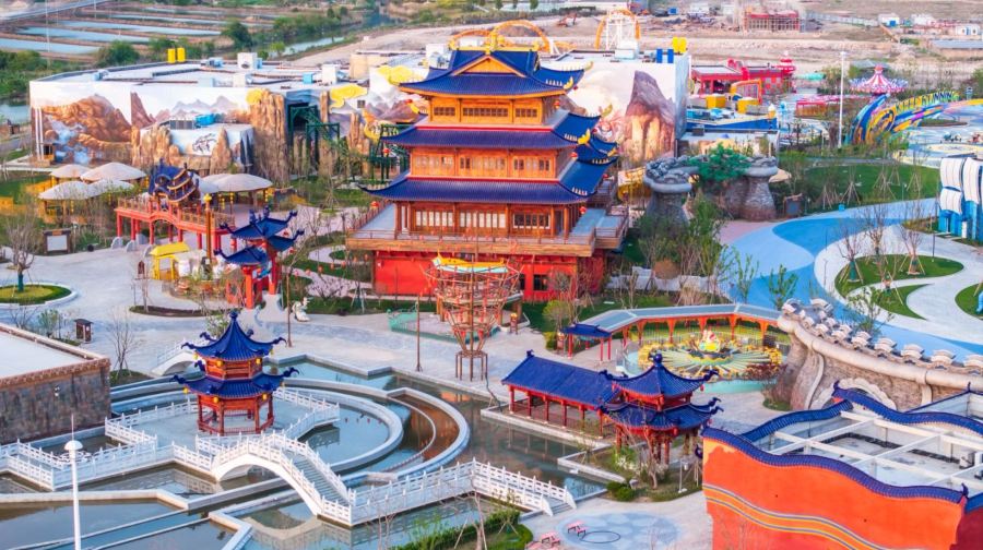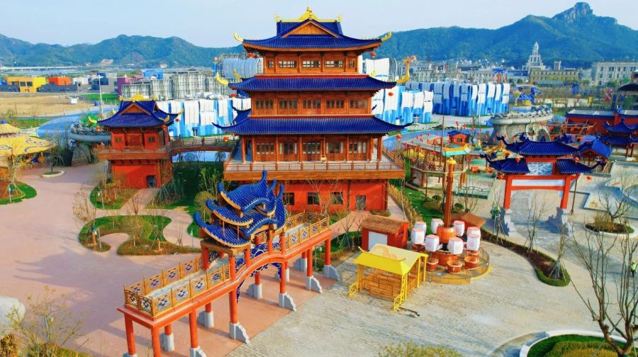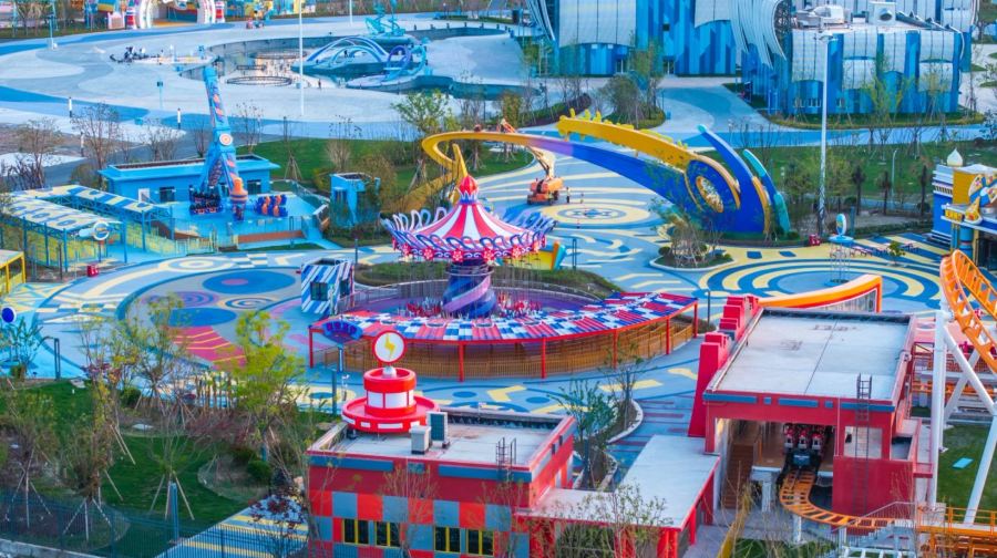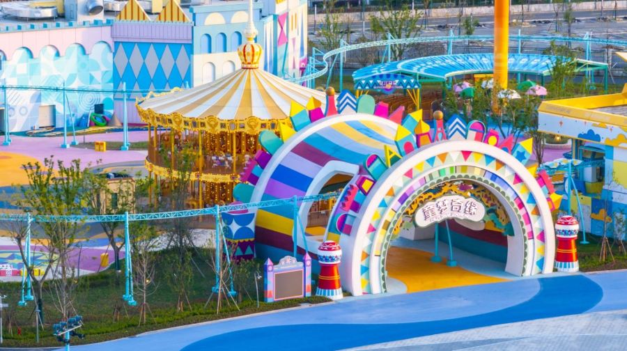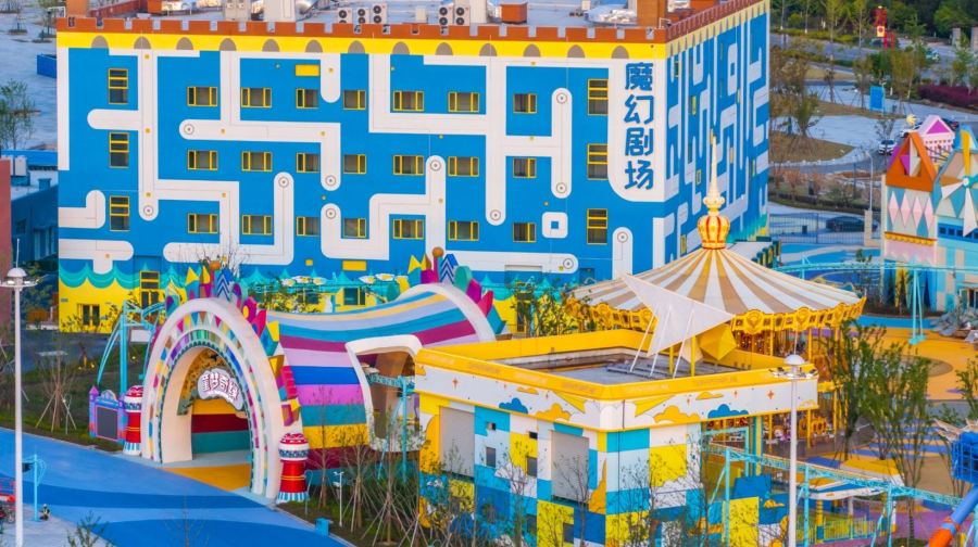 中国海影城“奔跑吧乐园”是国内一个综艺乐园,占地1000亩,集游乐设施、商业街区、酒店住宿于一体。