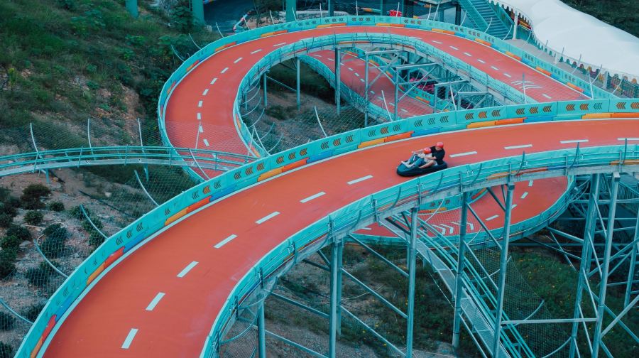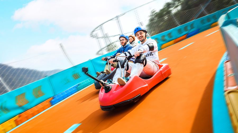 “滑出边际”共有4条滑道,每条长度150m,滑道色彩鲜艳,宛如一道悬挂在山间的彩虹。游客可乘坐滑盆从山顶疾驰而下,在失重感与速度变化的双重刺激中,放声尖叫,击碎压力。