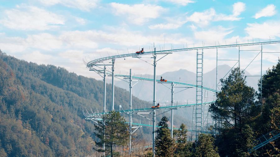 悬崖过山车全长2.5公里,依山巅岩壁凌空而建,蜿蜒起伏,根据山体走势盘旋而下,游客可坐在滑车上,沿轨道滑行,享受速度和刺激带来的愉悦体验,是一种极具趣味性的户外休闲娱乐设备。