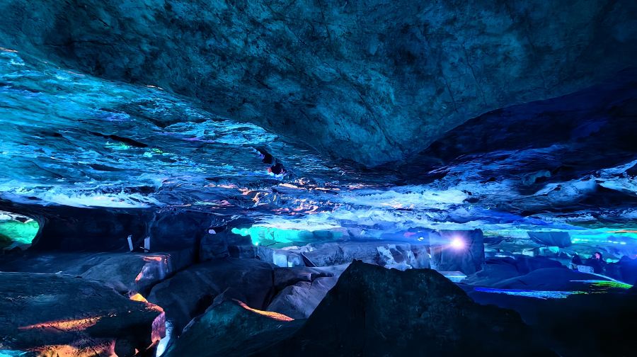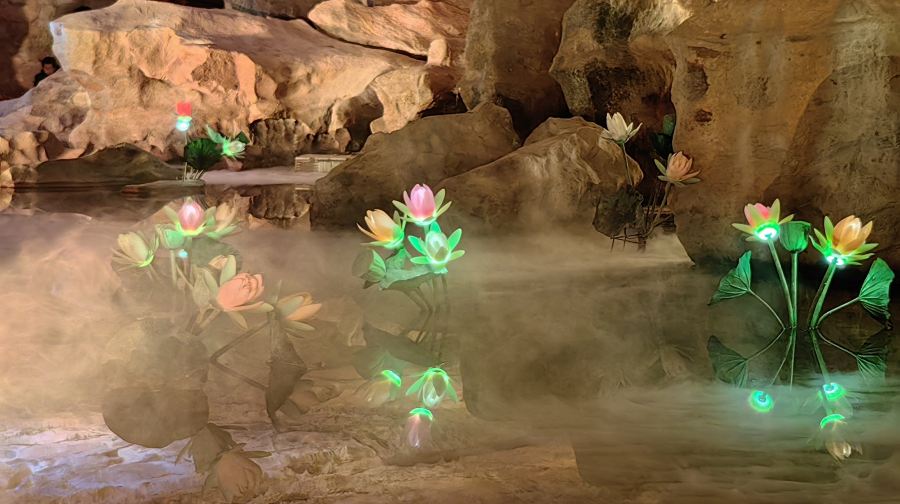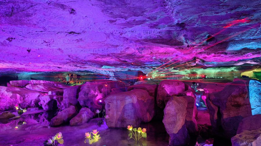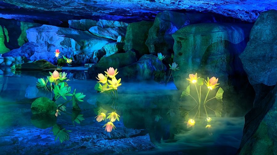 跨过水上的几块石头,便来到天后别宫洞,这里有一些水景可看。然后到达金龙洞,洞顶的一道裂隙中有不少石花、石柱,整体像一条龙,该洞出土过道教投龙仪式所用的金龙,真迹在苏州博物馆有看。沿着180度转弯的道路经过丙洞,到达阳谷洞,是一处相对宽敞的“厅堂”。出林屋洞的道路狭窄且洞顶很低,注意别碰头,洞顶有一些石花可看。